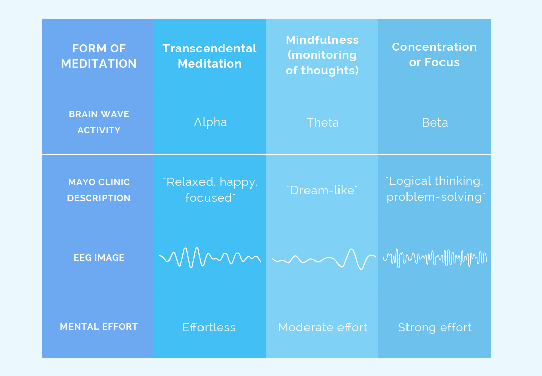 A major research study at American University found that TM increases alpha brain waves. The Mayo Clinic describes alpha brain waves as being associated with a «relaxed, happy, focused» state of mind.